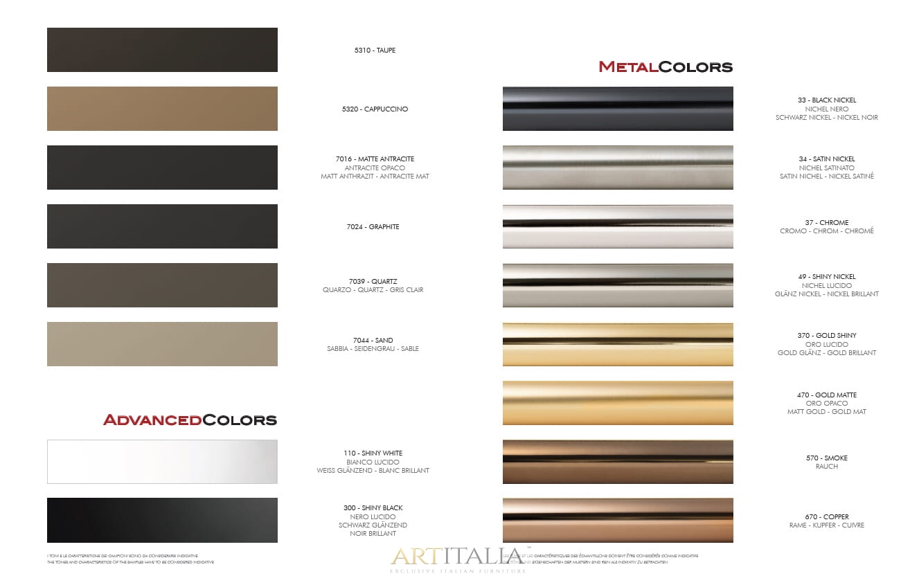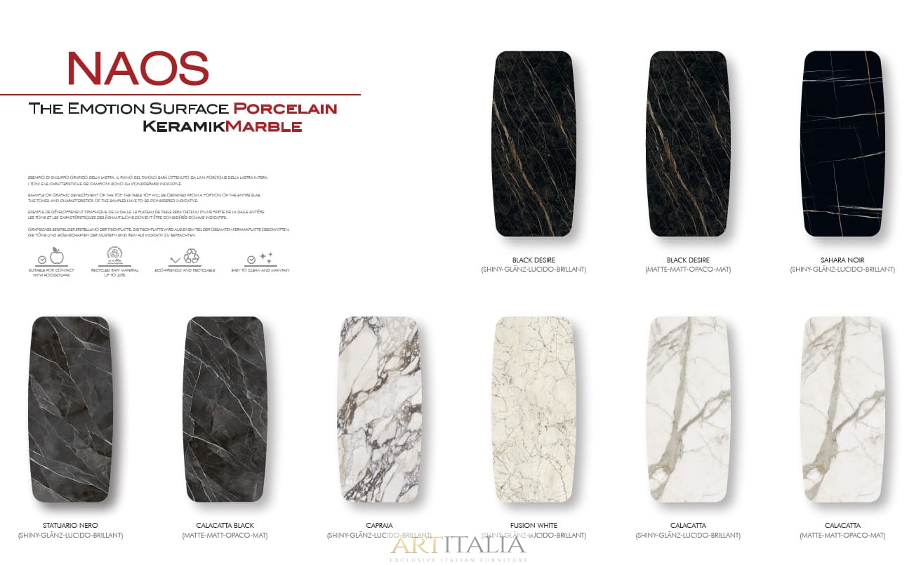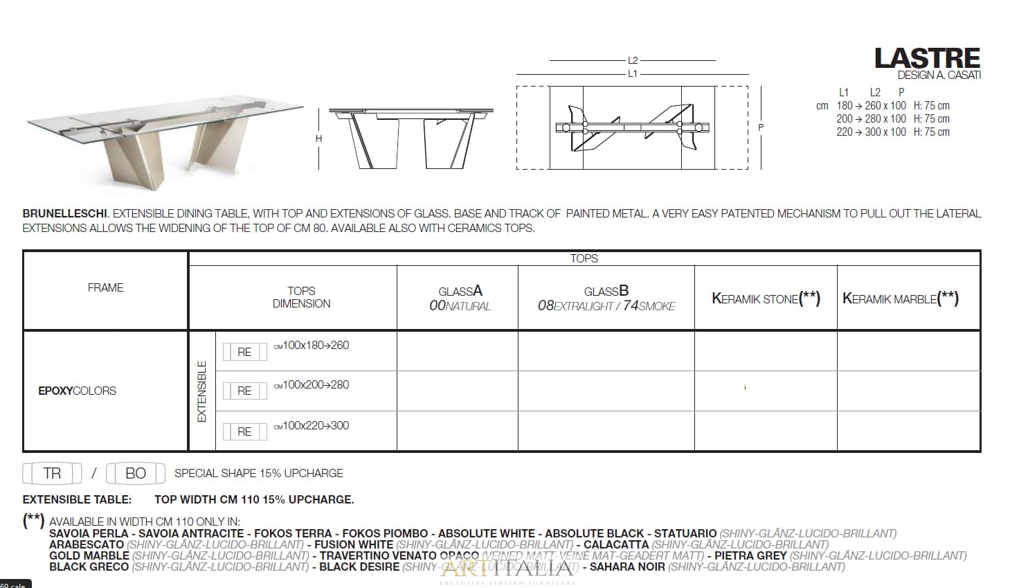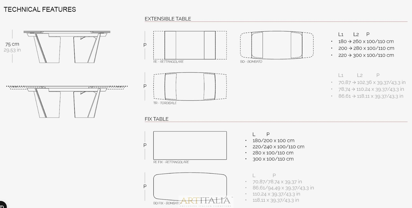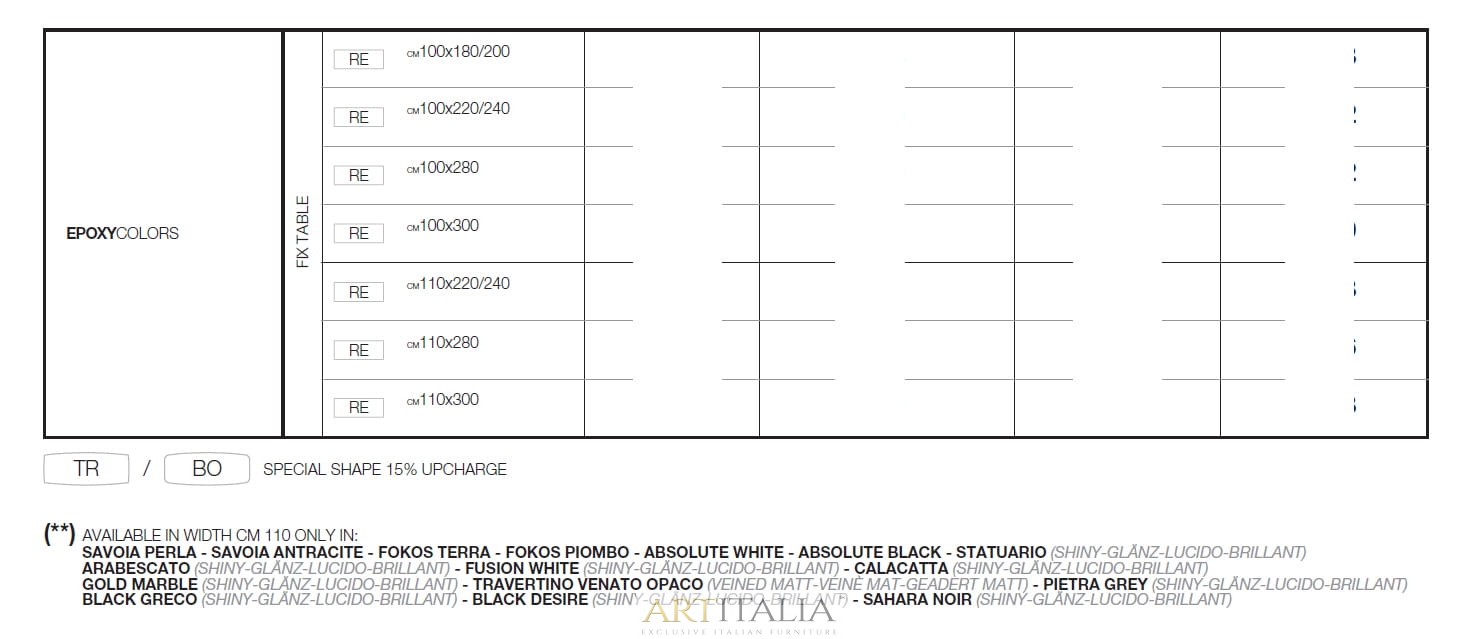 Stół dostępny jest w wersji rozkładanej (Extensible) oraz stałej (Fix) w różnych kształtach blatu: prostokątnym (RE), bombato (BO) oraz toroidalnym (TR).