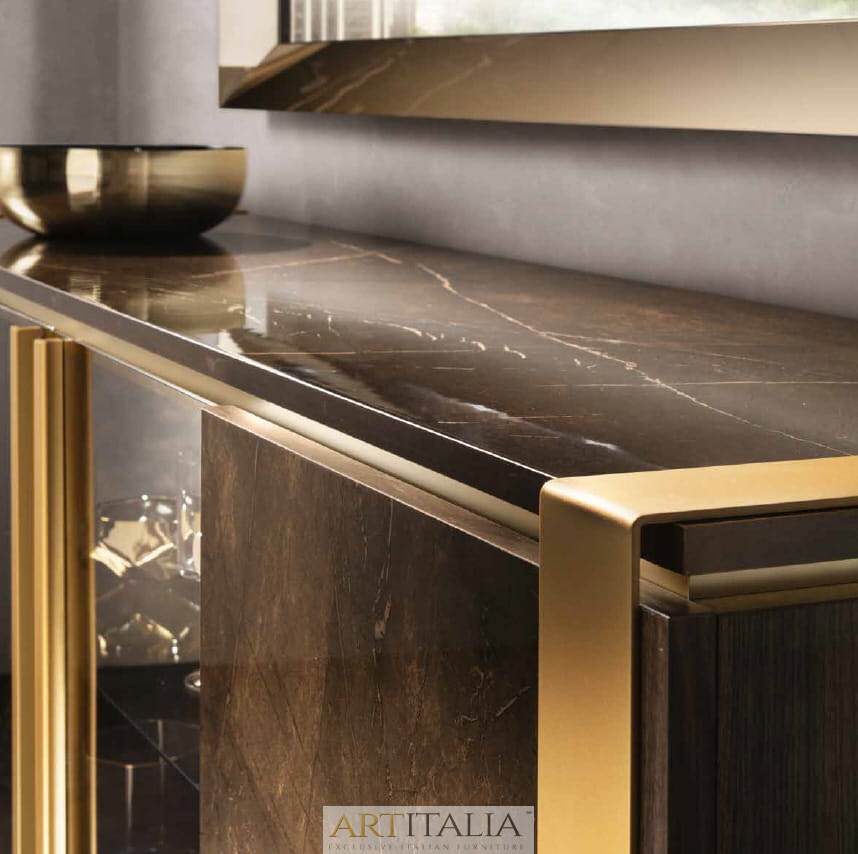 - Metaliczne nogi i rama: Charakterystyczny dla kolekcji Essenza jest masywny, ale jednocześnie nowoczesny złoty stelaż. Bufet jest oparty na wysokich, smukłych, ale stabilnych nogach w kolorze satynowanego złota/mosiądzu. Ten sam złoty akcent otacza górną krawędź bufetu, tworząc spójną i luksusową ramę.