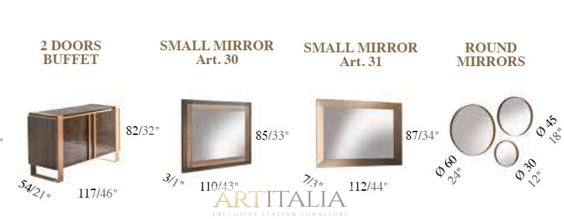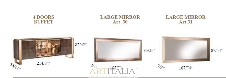 - Lustro uzupełniające (opcja za dopłatą): Nad bufetem często wieszane jest prostokątne lustro z tej samej kolekcji, otoczone szeroką, fazowaną ramą w kolorze satynowego złota (dwie wersje), co optycznie powiększa przestrzeń i potęguje luksusowy efekt.