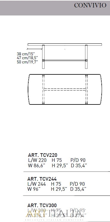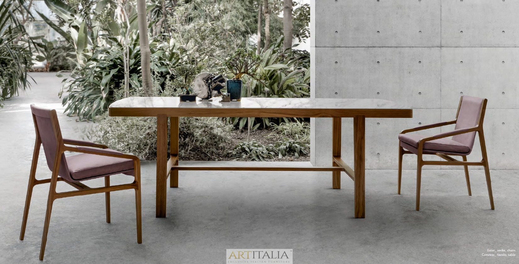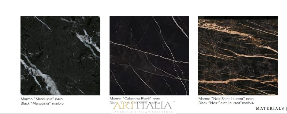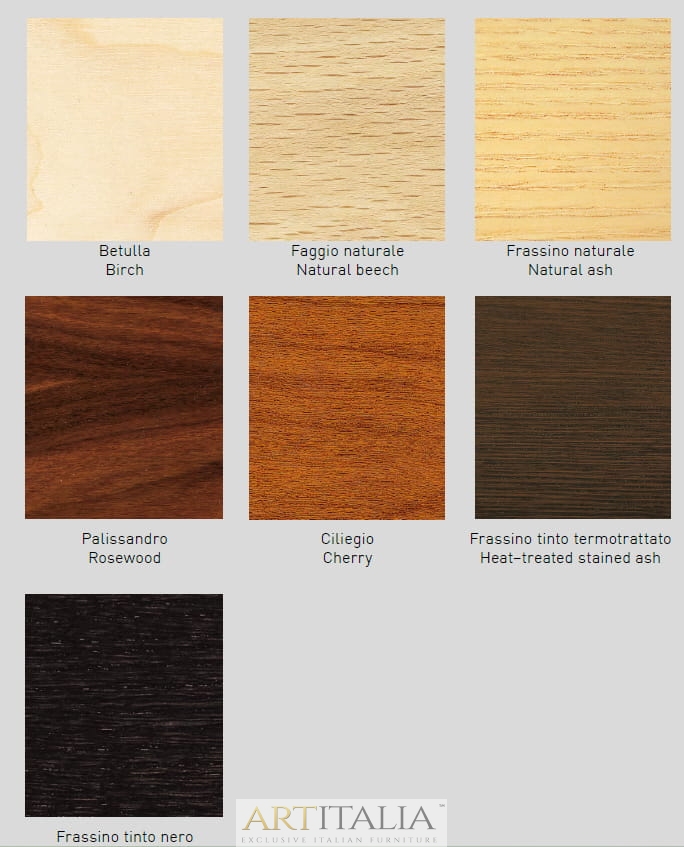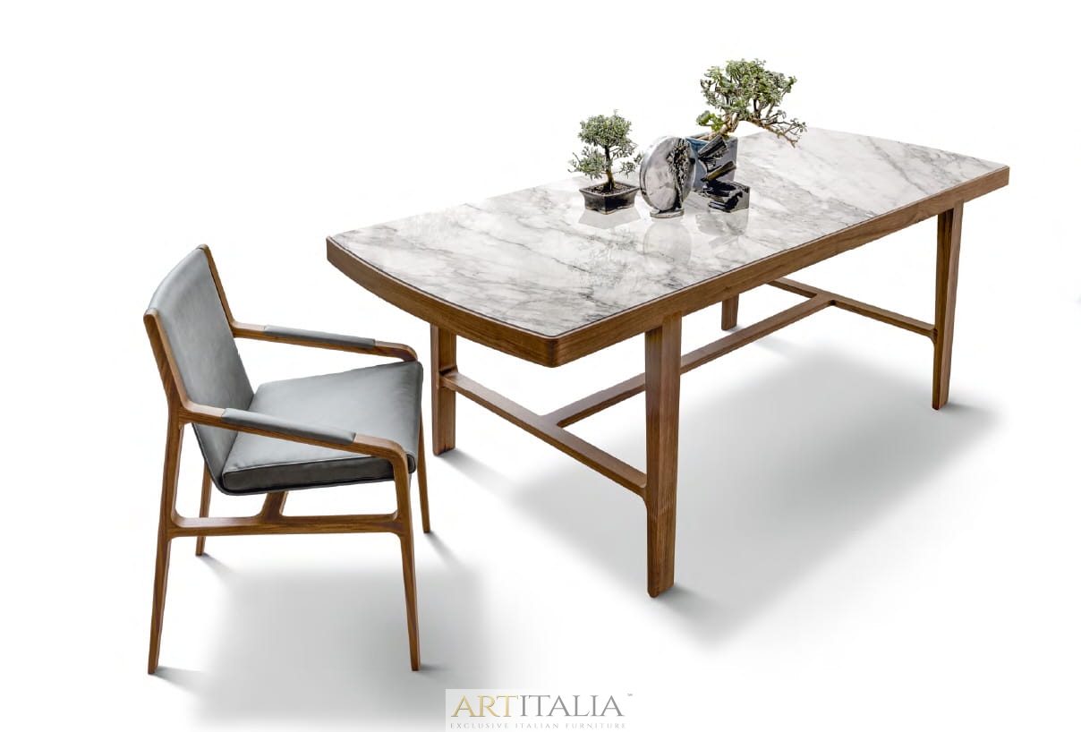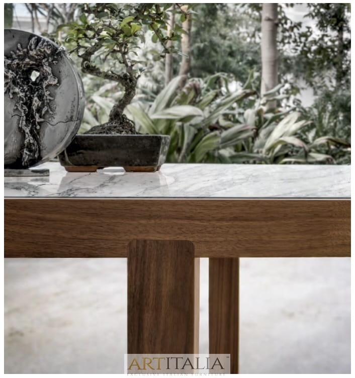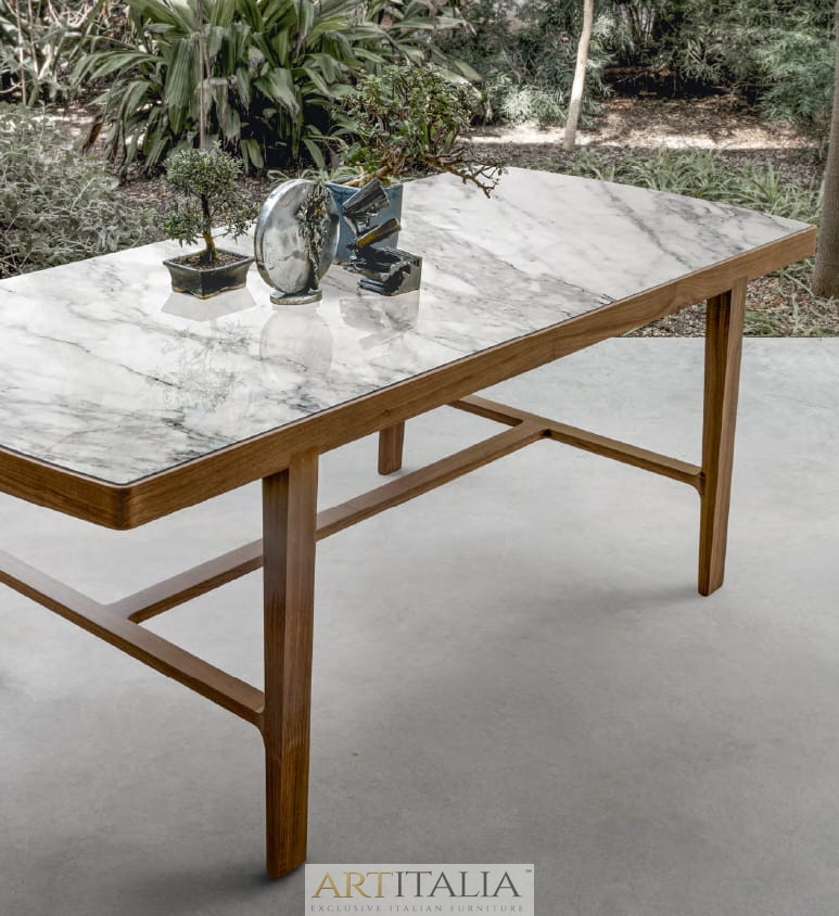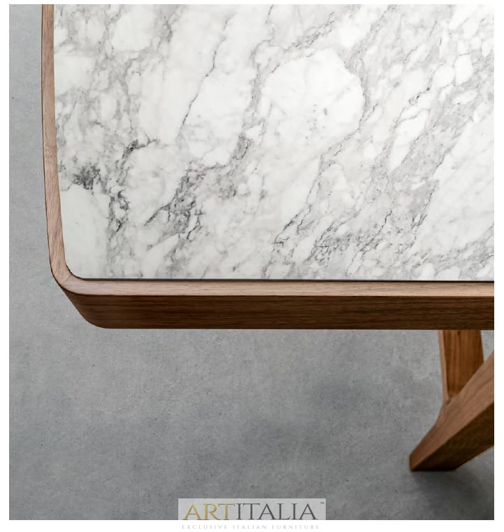 Rama z litego malowanego jesionu lub litego orzecha canaletto (za dopłatą). Blat z marmuru lub ceramiki o grubości 5 mm. w połączeniu z ekstra czystym przezroczystym szkłem o grubości 10mm.