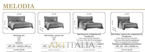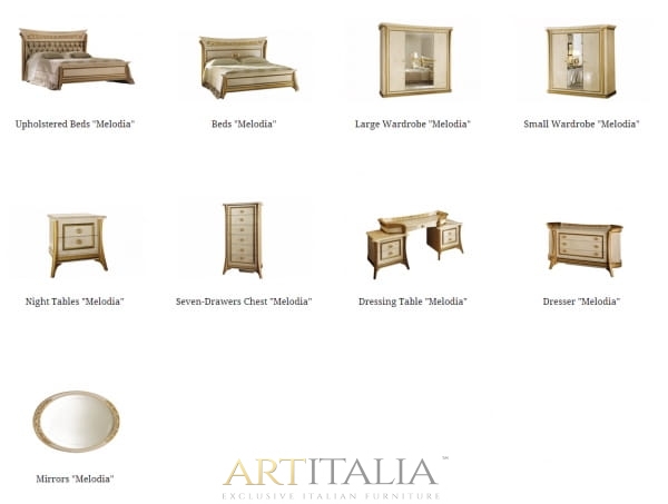 Ekskluzywny komplet mebli wloskich do sypialni Melodia Arredo. Zestaw można dowolnie konfigurować o inne meble uzupełniające. Przykładowo wyceniony zestaw mebli (jak na zdjęciu głównym) składa się z następujących elementów: