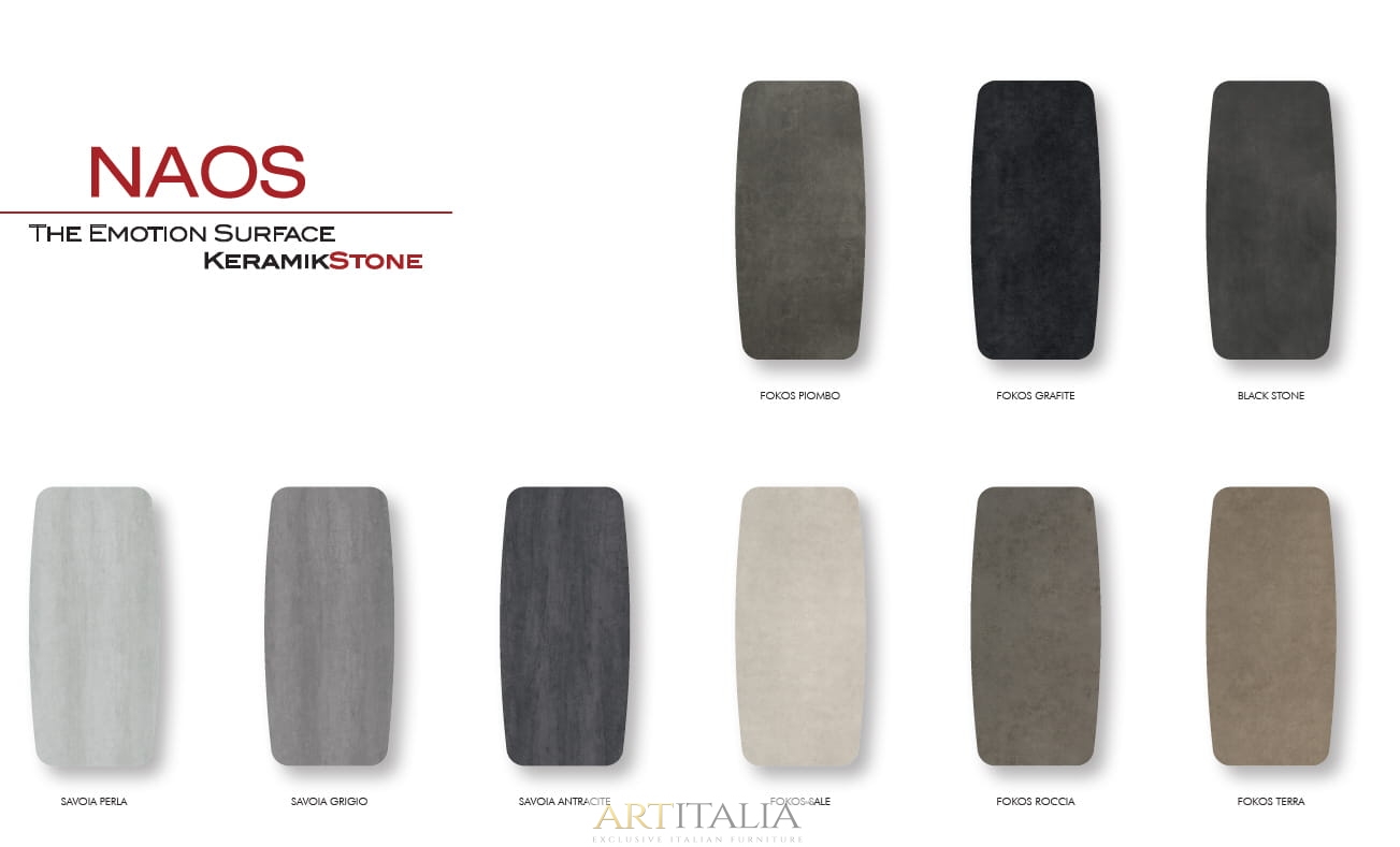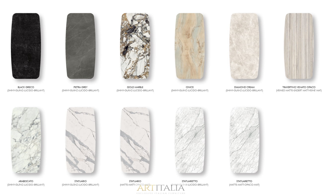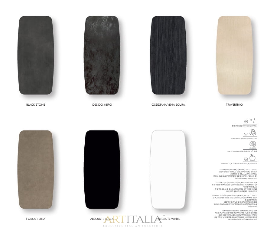 Blat: Szeroki wybór wykończeń obejmuje krystalicznie czyste, ekstra przeźroczyste szkło, które eksponuje formę podstawy, a także ekskluzywną ceramikę z serii Keramika Marble oraz Keramika Stone, łączącą naturalne piękno kamienia z niezwykłą odpornością na zarysowania i temperaturę.