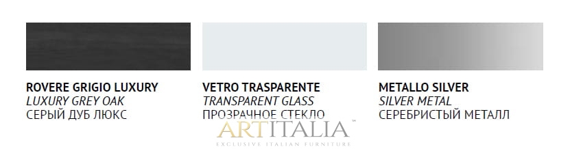 - Kolekcja VULCANO: laminat LUXURY GREY OAK / szkło TRANSPARENT GLASS / elementy metalowe SILVER METAL