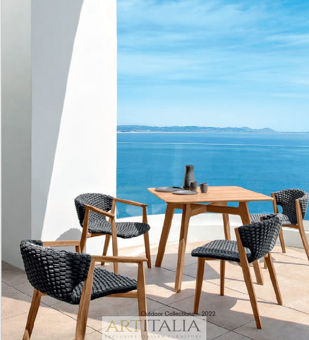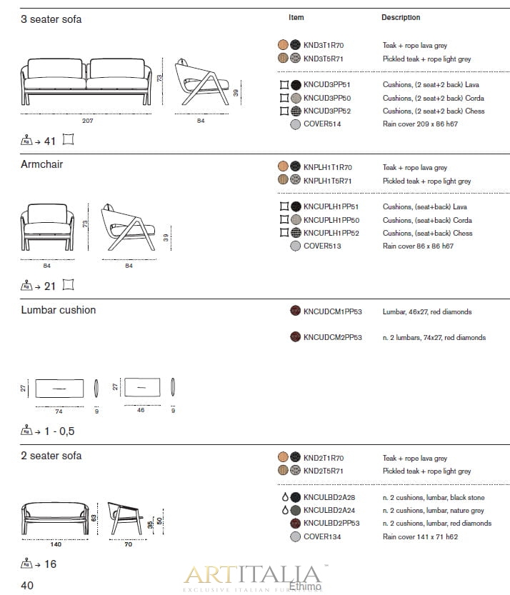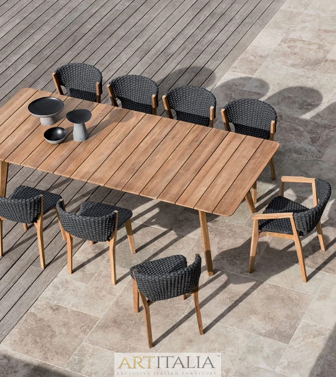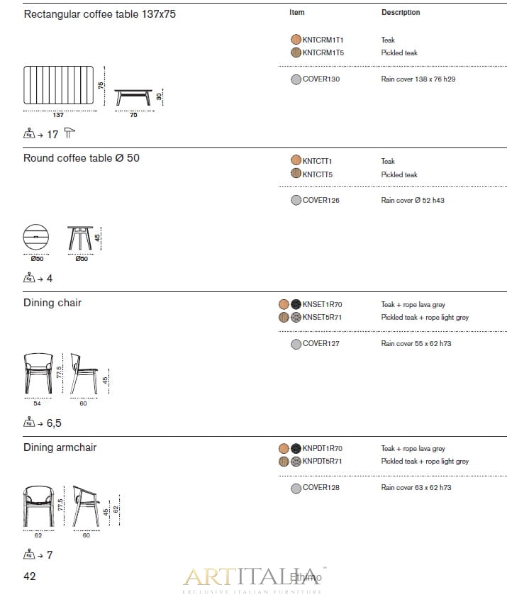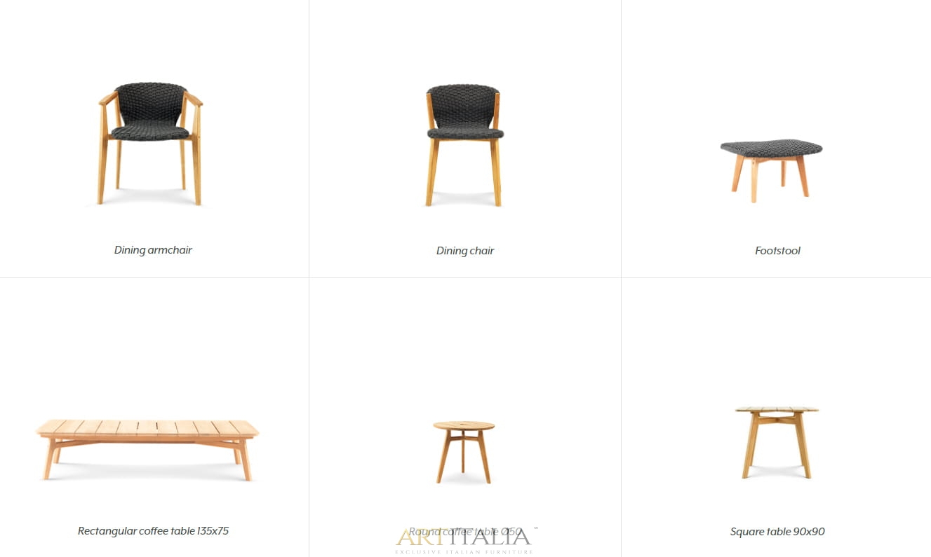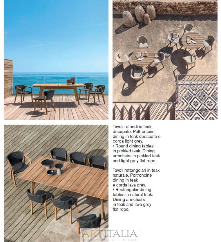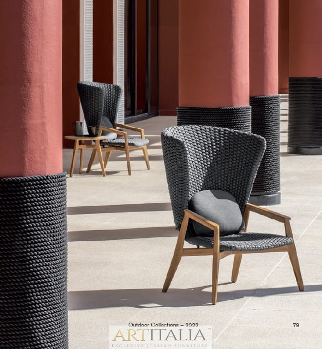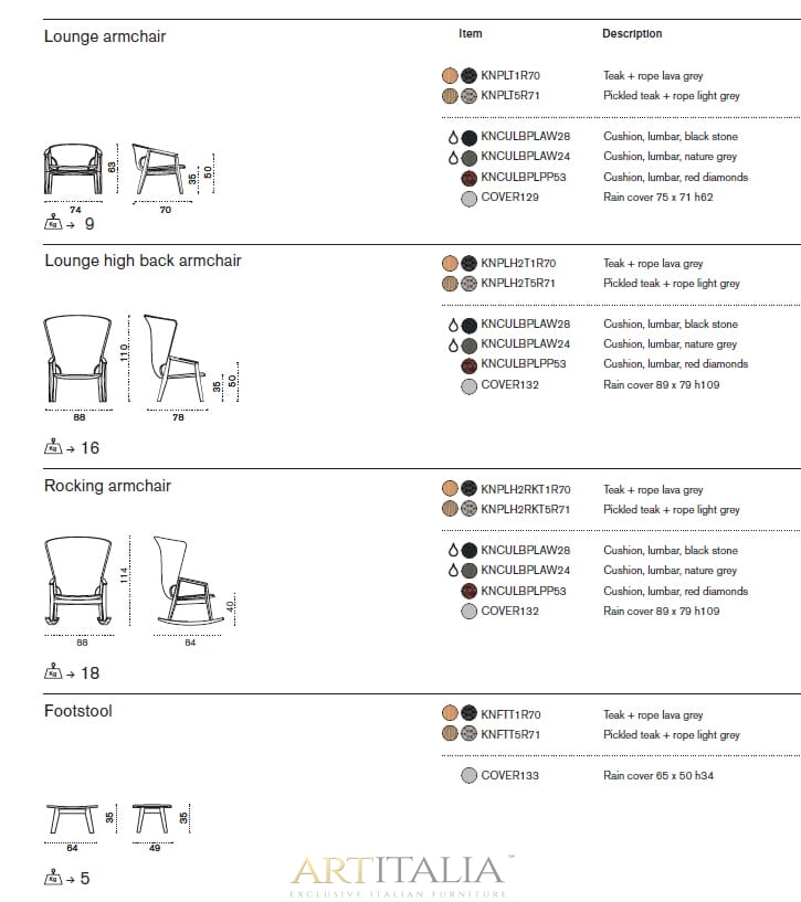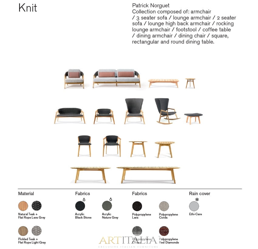 Knit to kolekcja stołów, krzeseł i foteli wypoczynkowych z drewna tekowego i plecionej liny, która z wyrafinowaniem wyraża doskonałą syntezę estetyki, funkcjonalności i ergonomii. Kultowa kolekcja została wzbogacona o nową wersję z konserwowanego drewna tekowego i jasnoszarej liny oraz bujaną wersję fotela z wysokim oparciem.