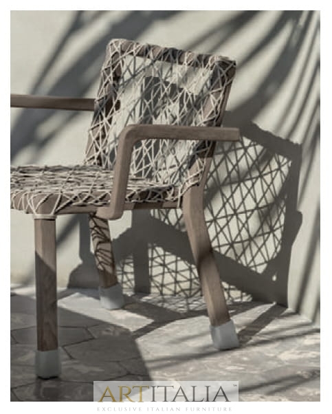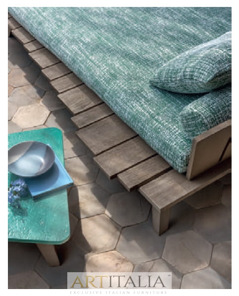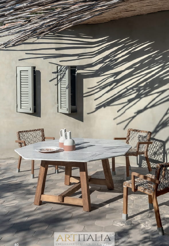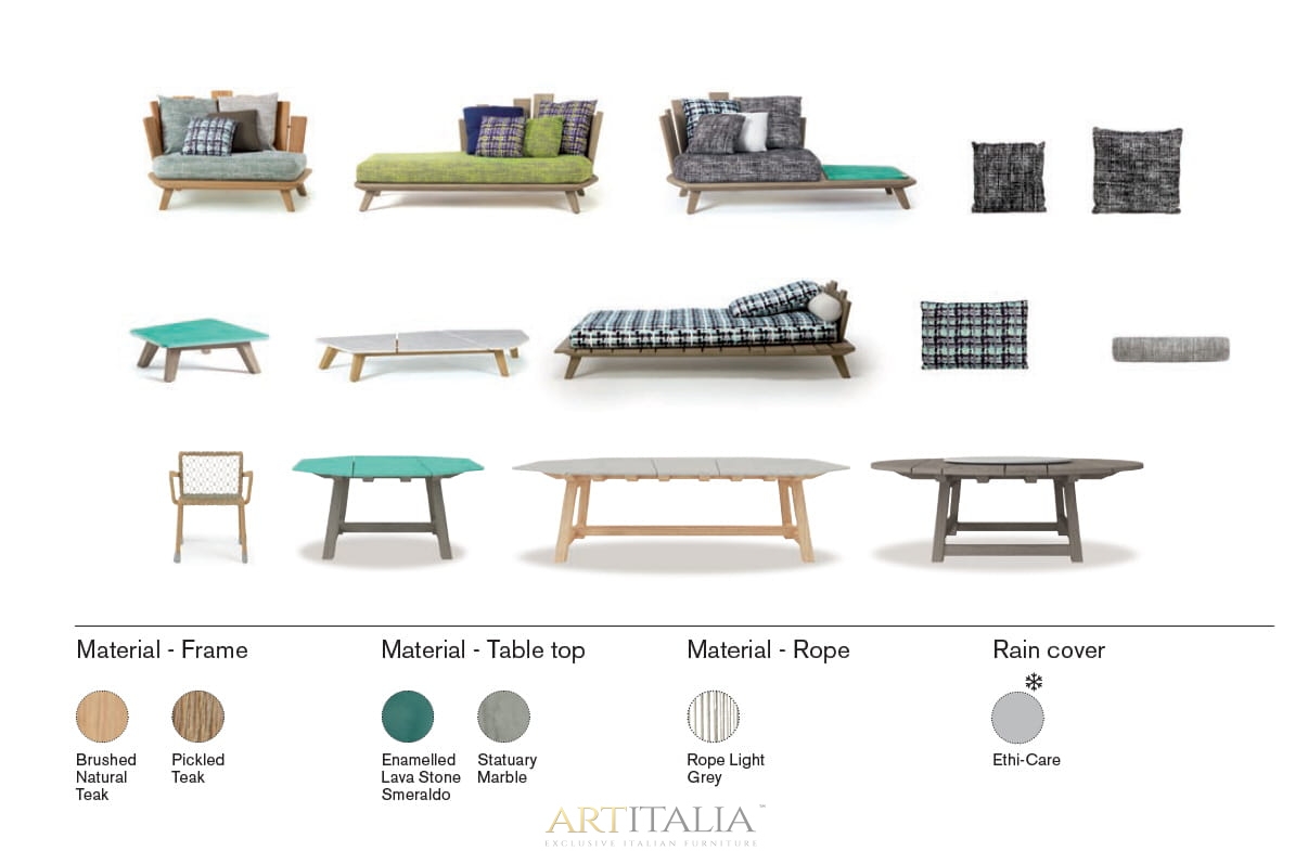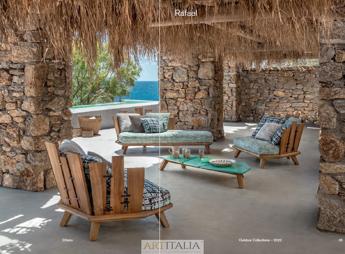 Rafael to kolekcja o nietuzinkowym wyglądzie i mocnym charakterze. Solidna konstrukcja ze szczotkowanego drewna tekowego z metalowymi zszywkami łączy się z fakturami i odcieniami poduszek. Stoły z białego marmuru lub kamienia glazurowanego w kolorze morza. Wszystkie elementy mogą być używane razem lub samodzielnie. Naprzemienne listwy tworzące oparcia ożywiają niezwykłe oryginalne sześciokątne profile ramy w nowym, postarzanym, naturalnym wykończeniu z drewna tekowego.