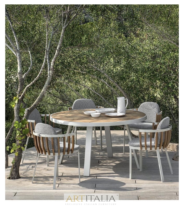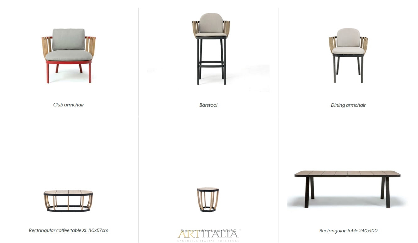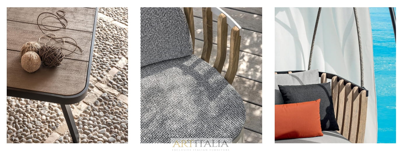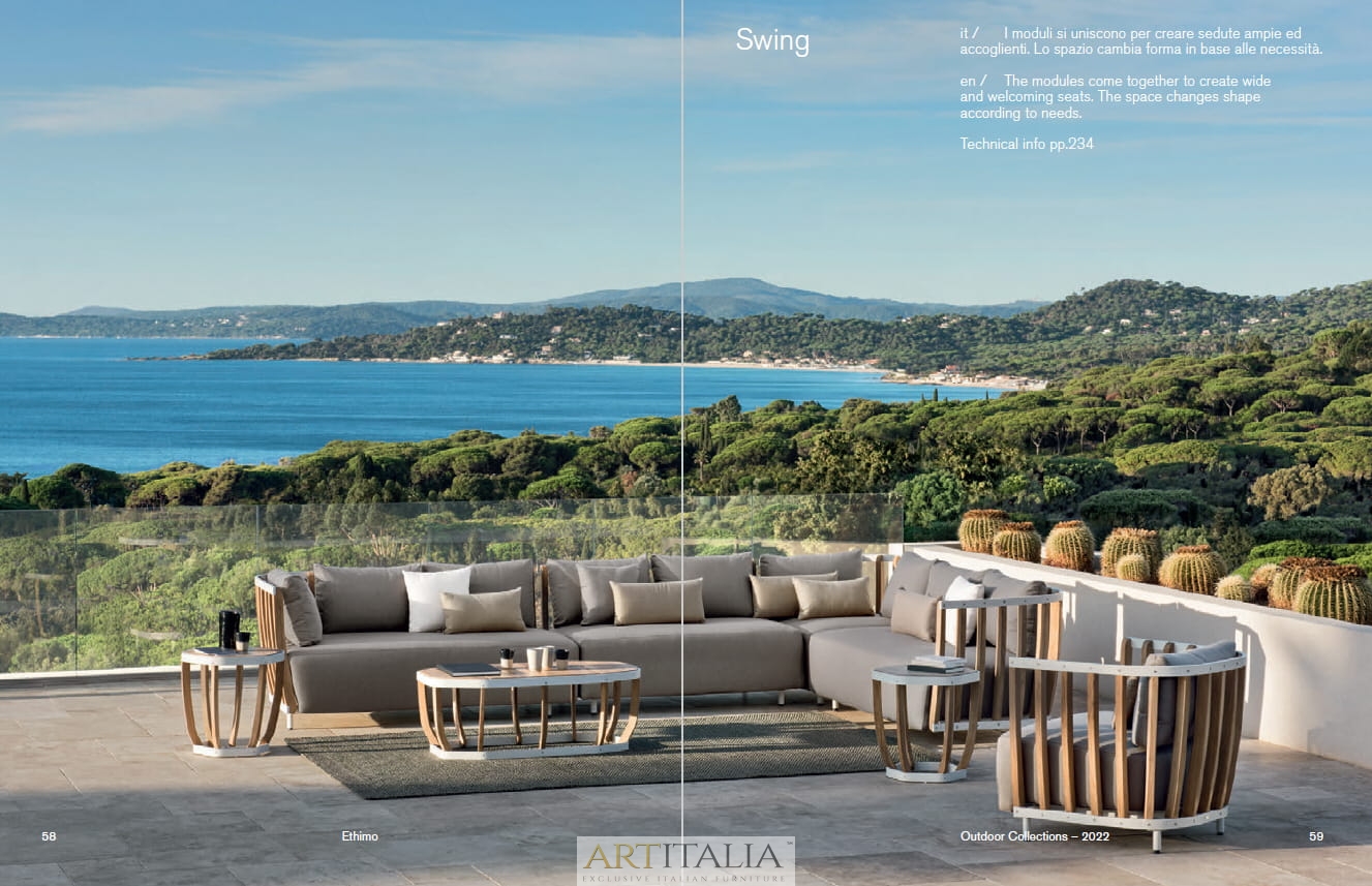 Współpraca między Ethimo i Patrickiem Norguetem dała początek kolekcji Swing. Konstrukcja mebli: jedna zewnętrzna warstwa metalowa, druga warstwa wewnętrzna wykonana z listew z drewna tekowego, których połączenie tworzy zrównoważoną alternatywę linii i materiałów.