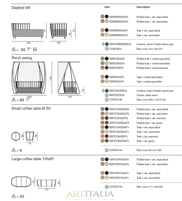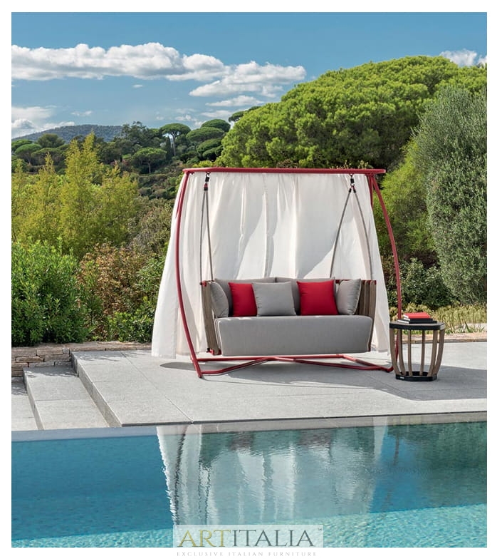 Kultowym elementem kolekcji jest duża huśtawka: pomyślana jako przytulne gniazdo, które ma zapewnić schronienie do wypoczynku. Ten element o wielkim uroku i oddziaływaniu wizualnym wnosi odrobinę elegancji do najbardziej wyrafinowanych przestrzeni.