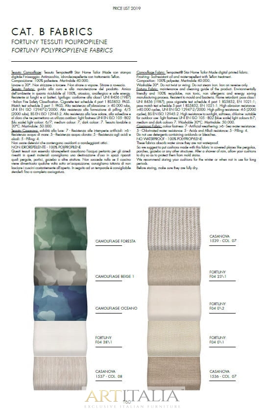 - materiały obiciowe na poduszki odporne na warunki atmosferyczne (dwa warianty): kategoria A oraz C Luxury z akrylu, kategoria B z polipropylenu