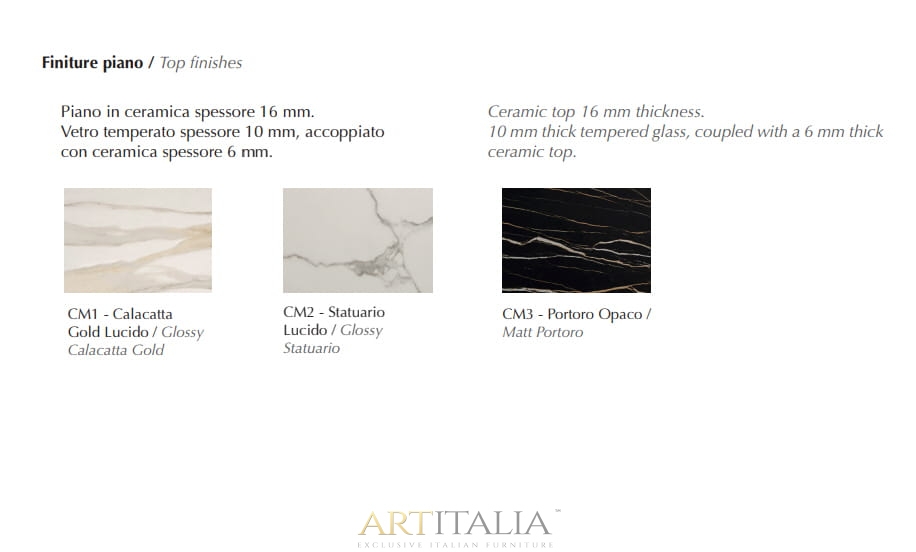 - Glossy Calacatta Gold CM1, Glossy Statuario CM2 Avorio CM8, Matt Portoro CM3