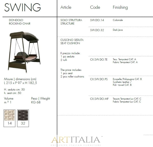Huśtawki produkowane są na zamówienie w dwóch kolorach technorattanu (na zdjęciach w galerii), podstawa na aluminiowych nóżkach, do kompletu wliczone są także: