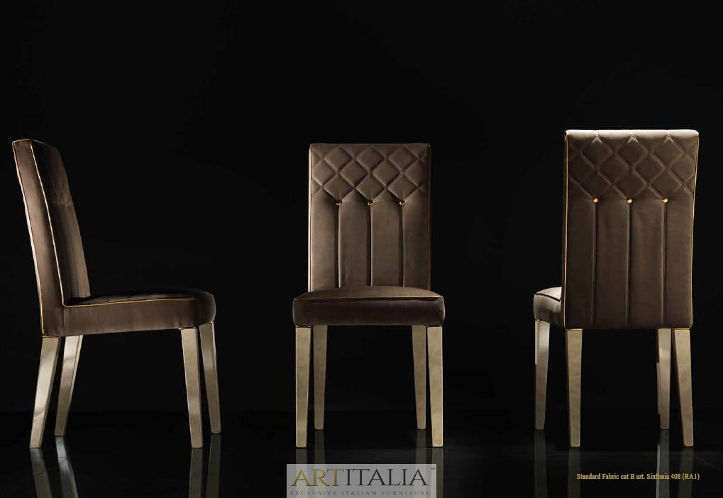 Krzesła Sipario: Charakteryzują się tapicerowanym oparciem i siedziskiem, z eleganckim pikowaniem i złotymi akcentami, zapewniając zarówno styl, jak i komfort.