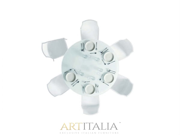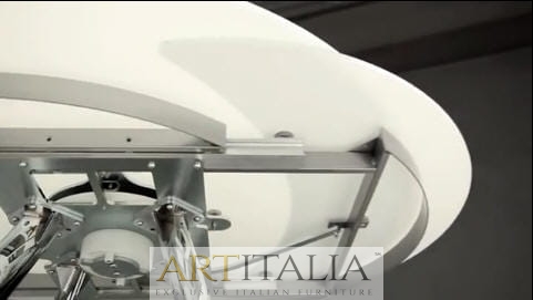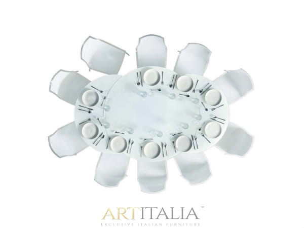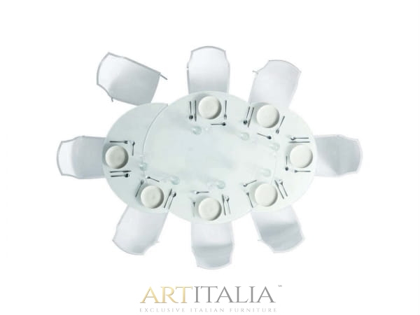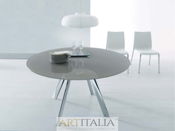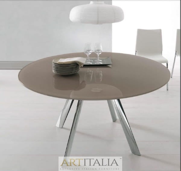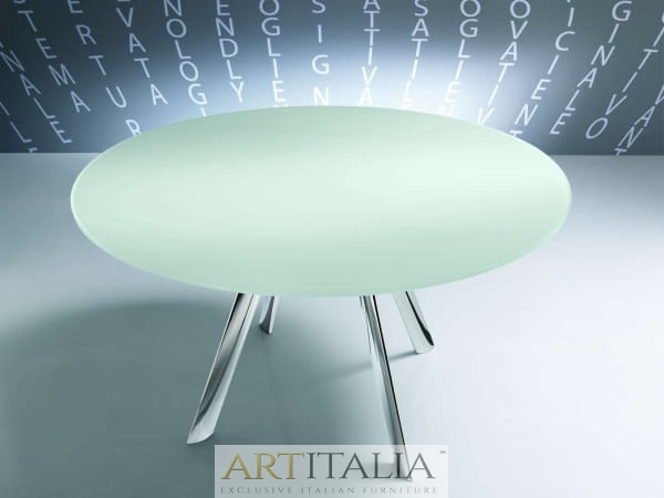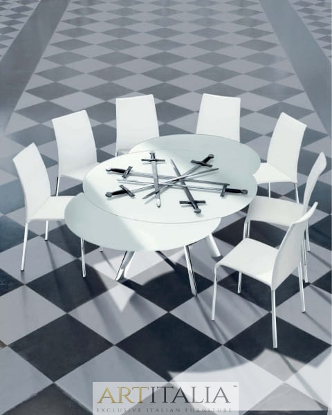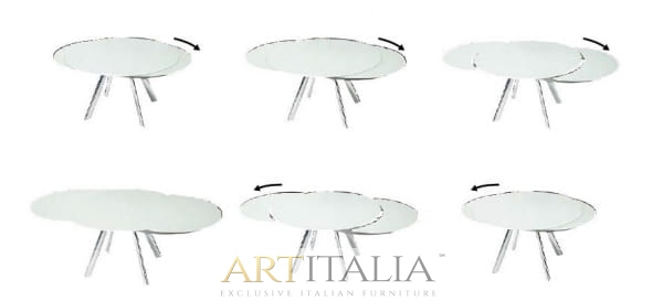 Stół Rot rozkładany, szklany blat, okrągły stół do jadalni. Nowatorski i niezwykle dekoracyjny sposób rozkładania stołu. Najwyższej jakości mechanizm pozwala rozkładać stół z niezwykłą łatwością.