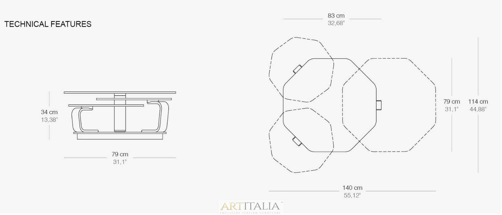 Wymiar złożonego stolika: 79 x 83 x h 34 cm / rozłożony 140 x 114 x h 34 cm