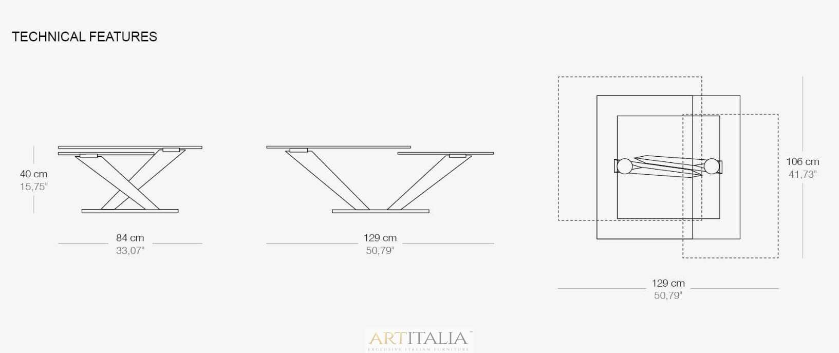 Wymiar złożonego stolika: 84 x 84 x h 40 cm / rozłożony 129 x 106 x h 40 cm