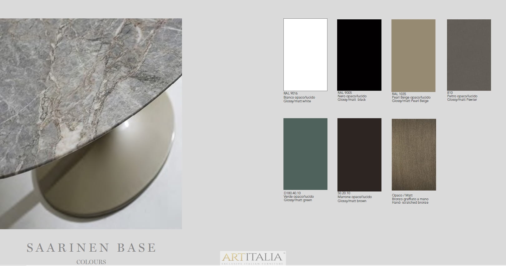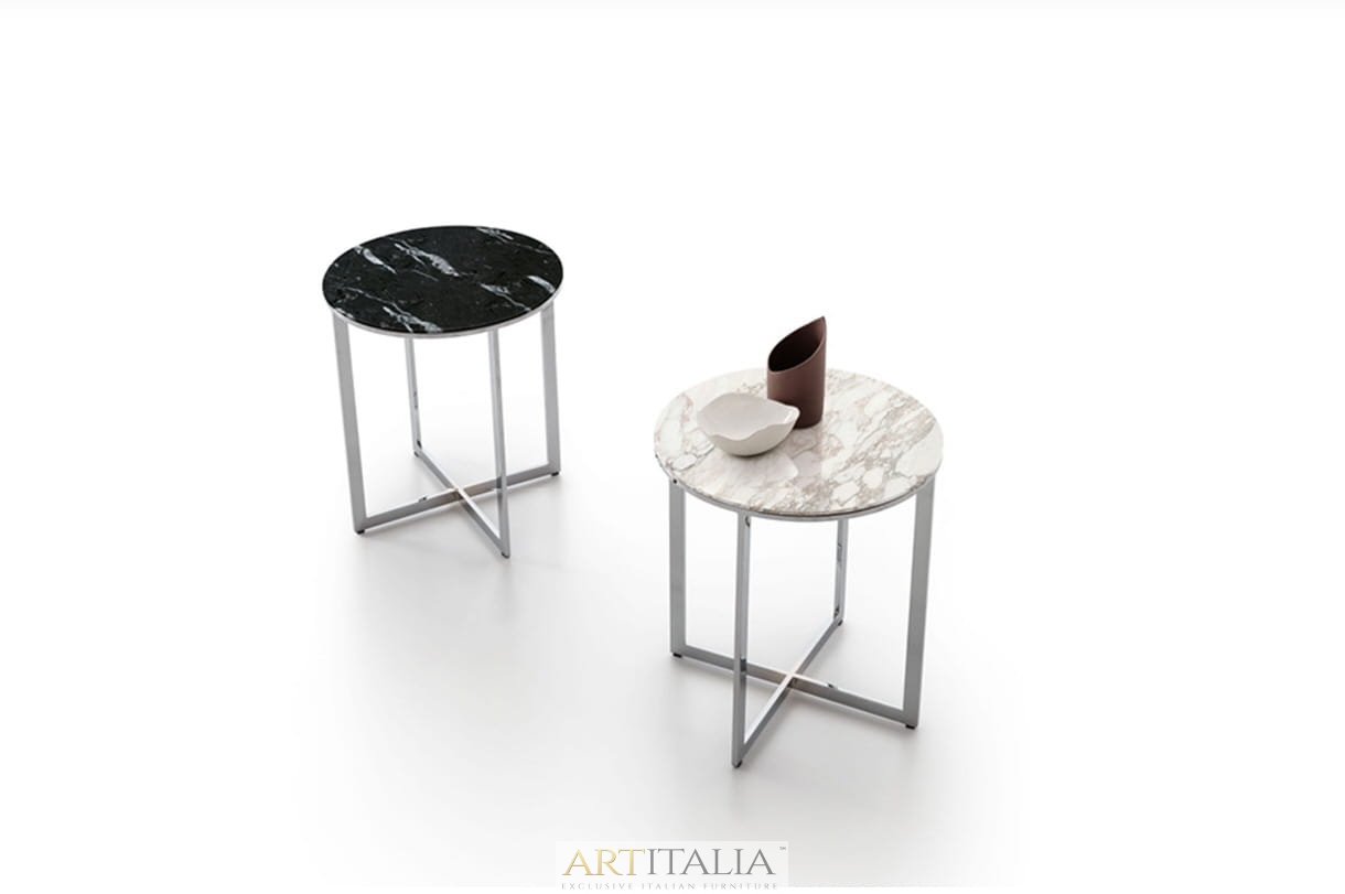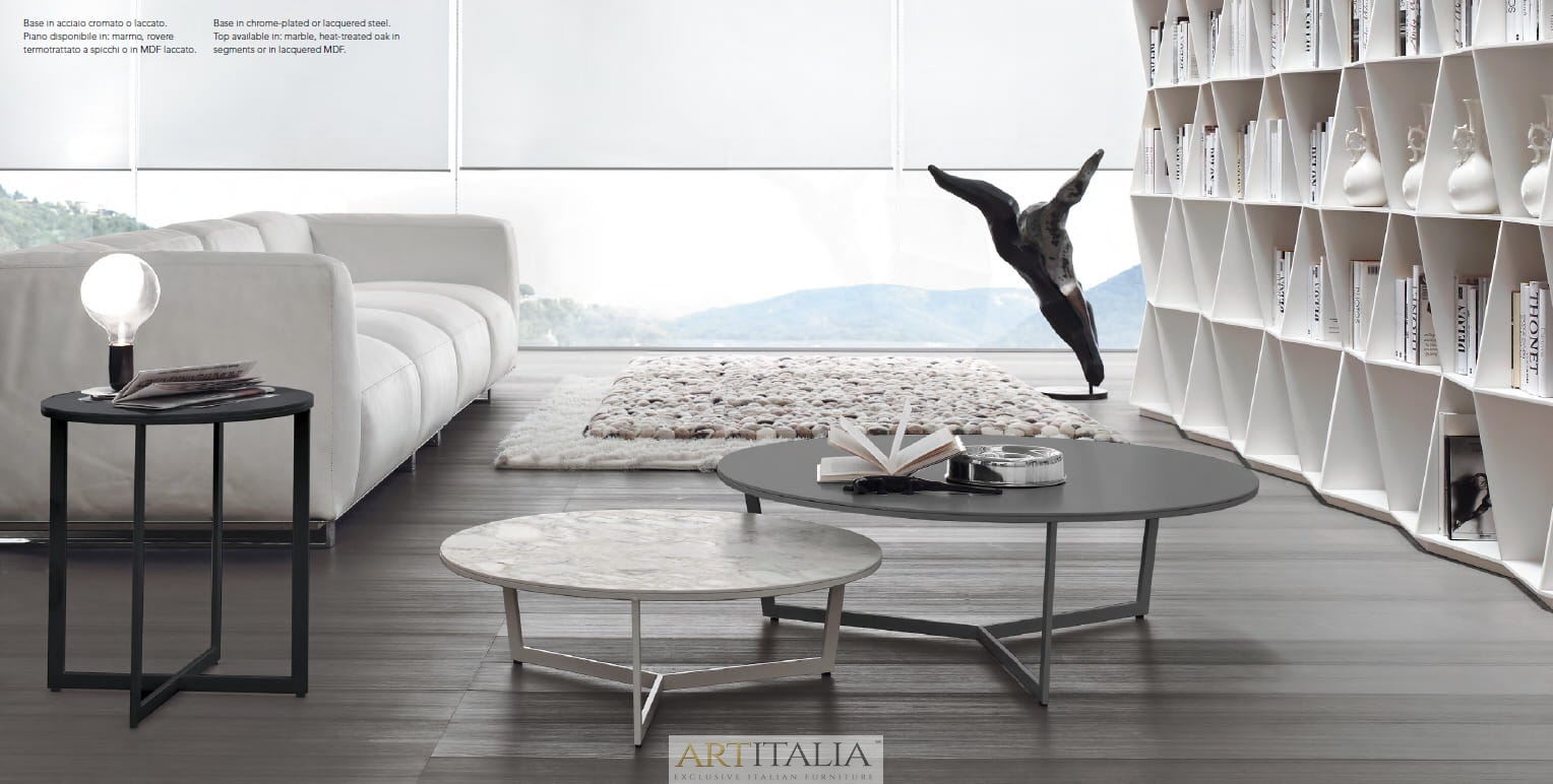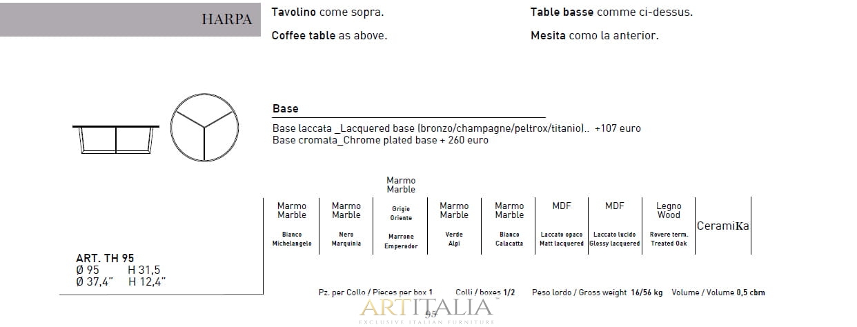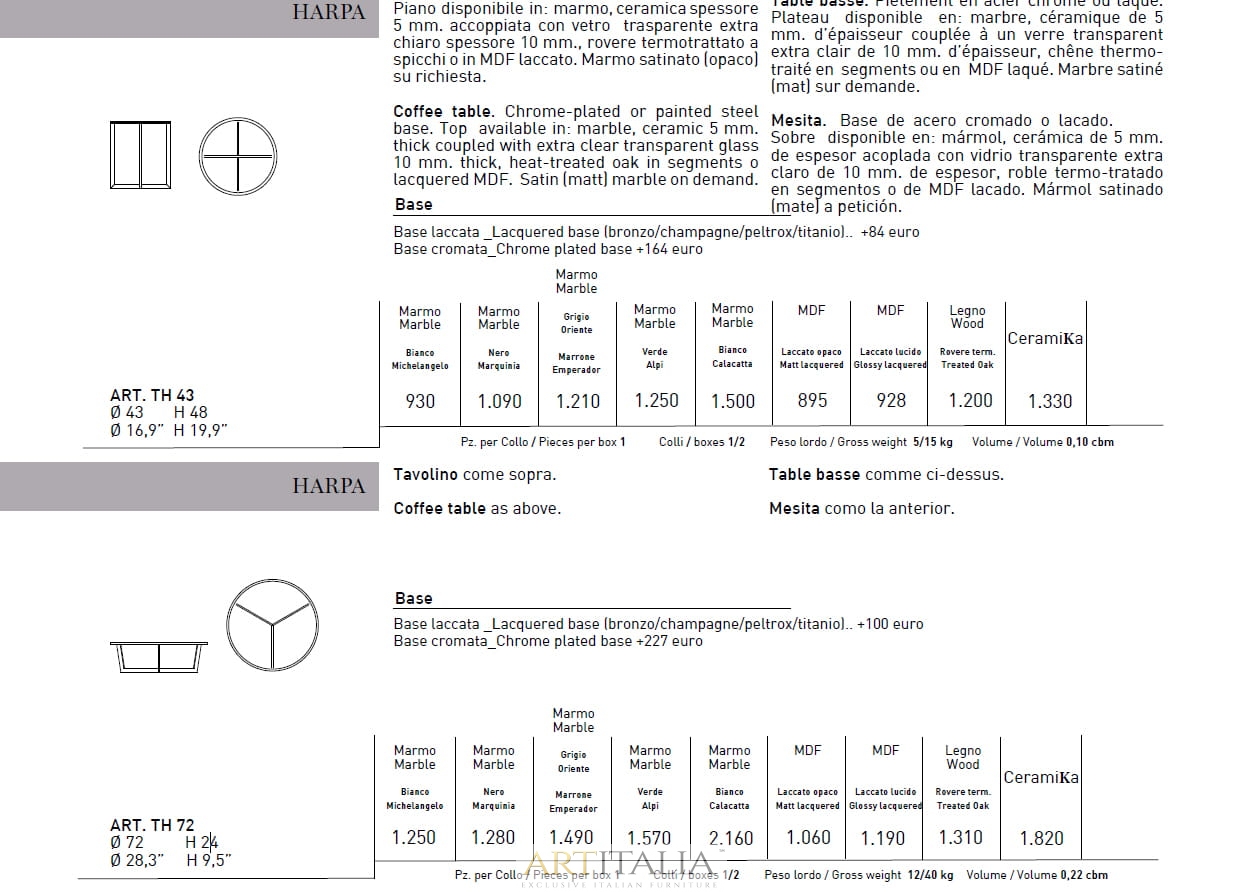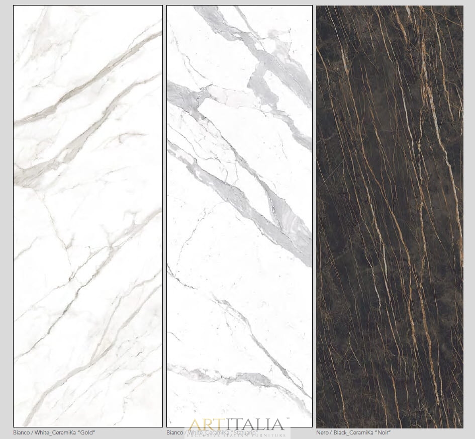 Podstawa ze stali chromowanej lub malowanej. Blat dostępny w: marmurze, ceramice 5 mm. grubości w połączeniu z ekstra czystym przezroczystym szkłem10 mm. grubości, dąb poddany obróbce cieplnej, lakierowanej płycie MDF. Satynowy (matowy) marmur na zamówienie.