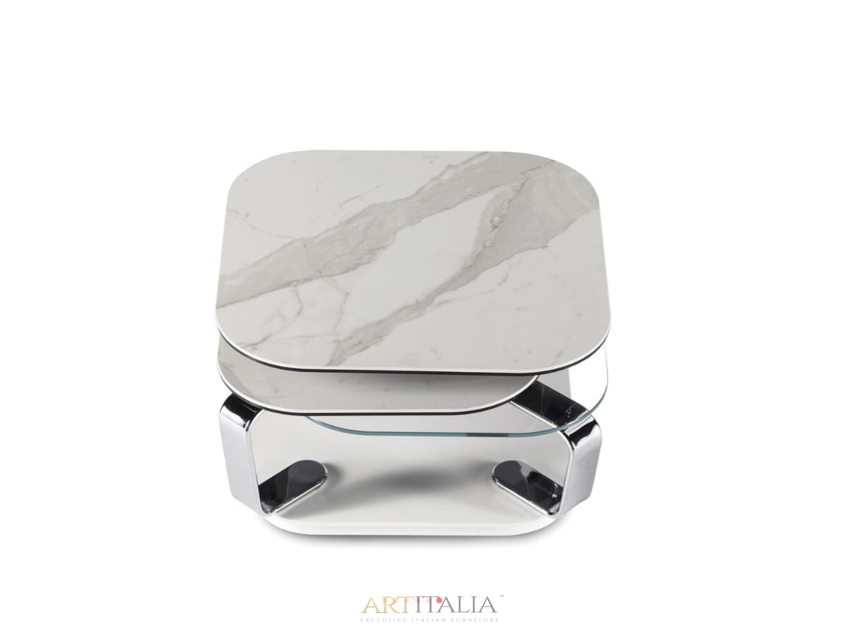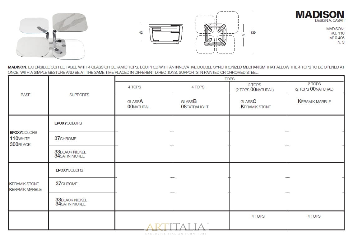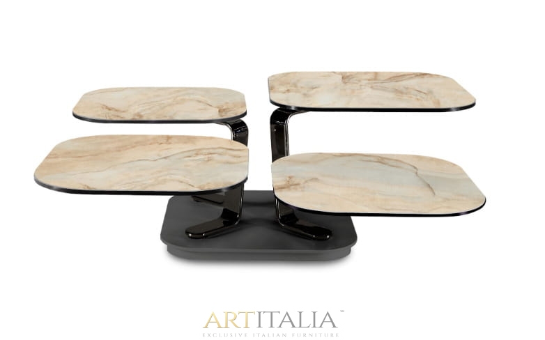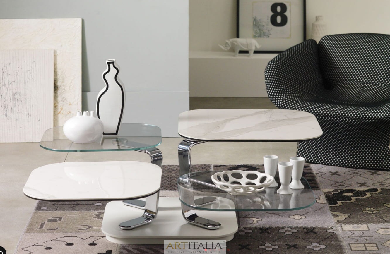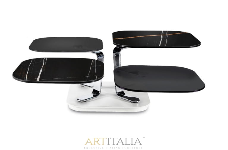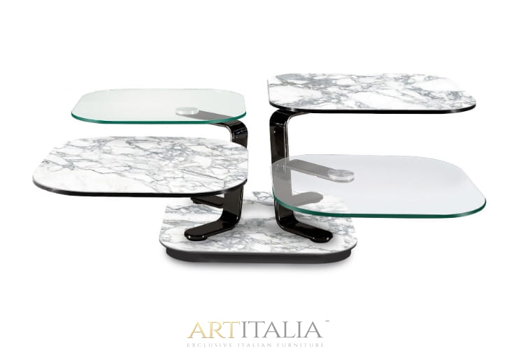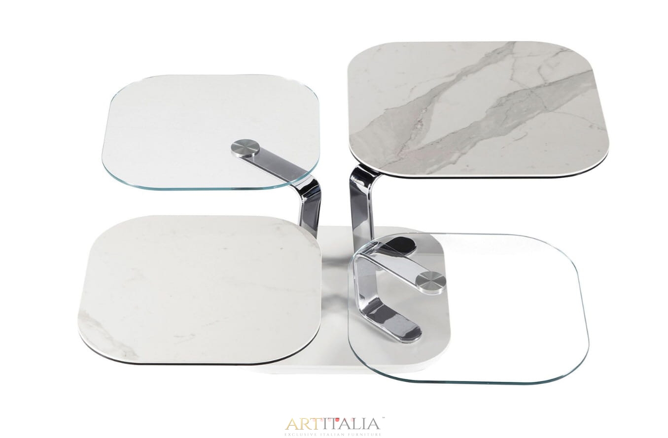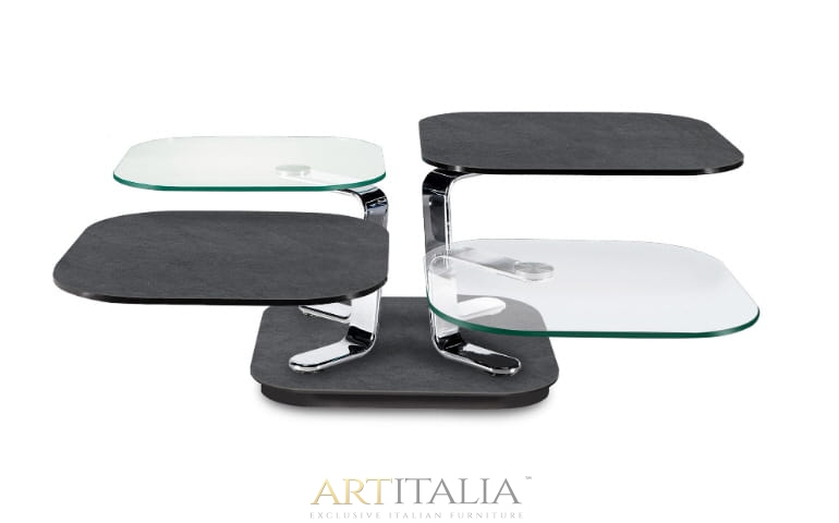 ROZKŁADANY STOLIK KAWOWY Z 4 BLATEM SZKLANYM LUB CERAMICZNYM. WYPOSAŻONE W INNOWACYJNY PODWÓJNIE Zsynchronizowany MECHANIZM, KTÓRY POZWALA NA OTWARCIE 4 BLATÓW JEDNOCZEŚNIE PROSTYM W RÓŻNYCH KIERUNKACH. WSPORNIKI ZE STALI MALOWANEJ LUB CHROMOWANEJ.