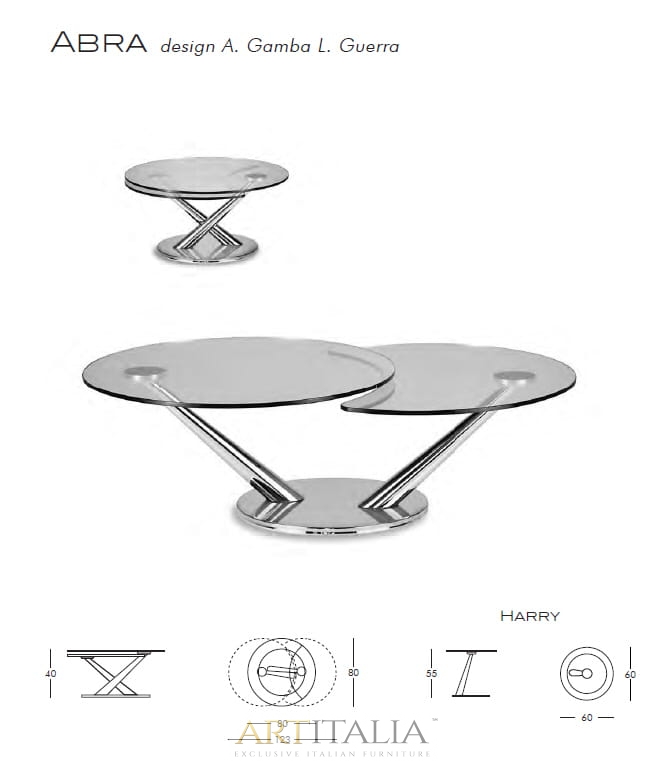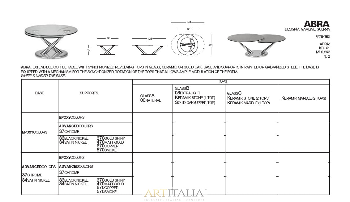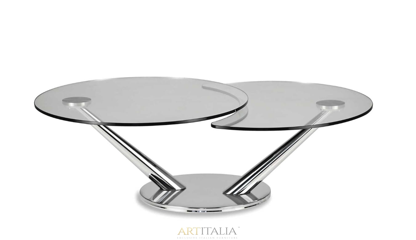 ROZKŁADANY STOLIK KAWOWY Z SYNCHRONIZOWANYMI BLATAMI OBROTOWYMI ZE SZKŁA, CERAMIKI LUB LITEGO DĘBU. PODSTAWA I WSPORNIKI ZE STALI MALOWANEJ LUB OCYNKOWANEJ. PODSTAWA JEST