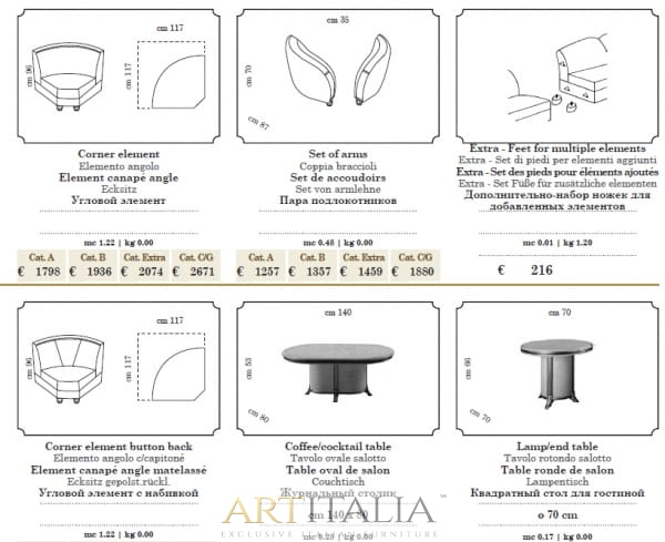 Cena sofy / fotela / narożnika uzależniona jest od kategorii materiału obiciowego (Cat. A Cat. B Cat. Extra Cat. C/G)