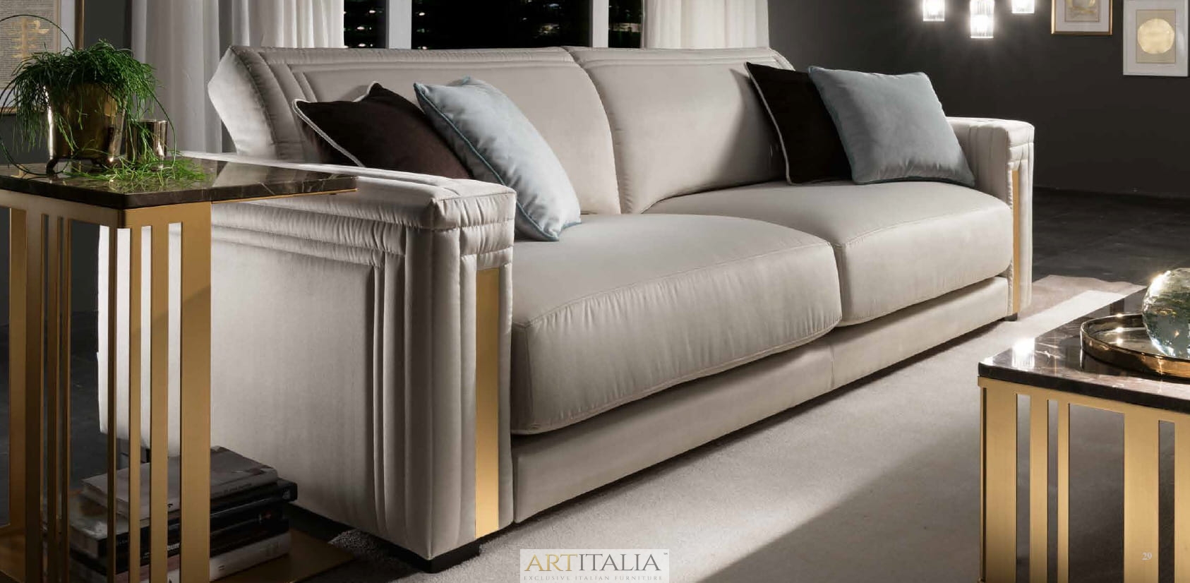 - Spójność kolekcji: Złote wykończenie podstawy stolika idealnie harmonizuje ze złotymi akcentami na podłokietnikach sof z kolekcji Atmosfera, spajając całą aranżację salonu w jeden luksusowy komplet.