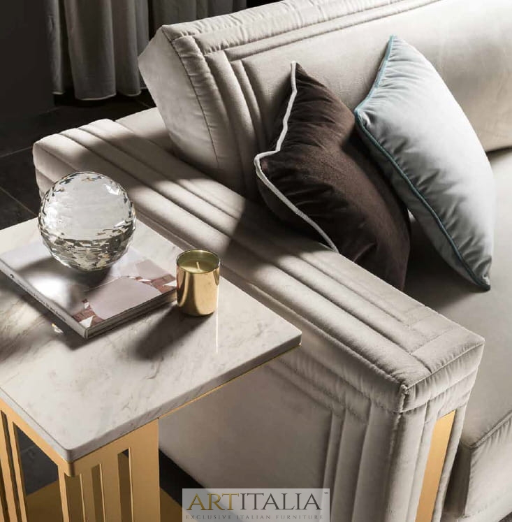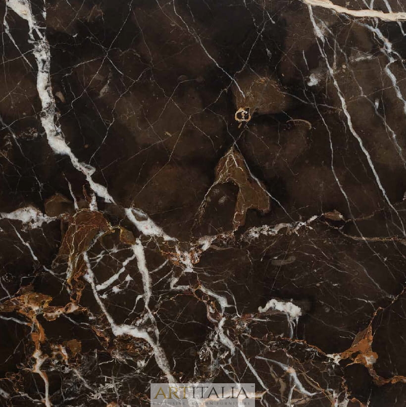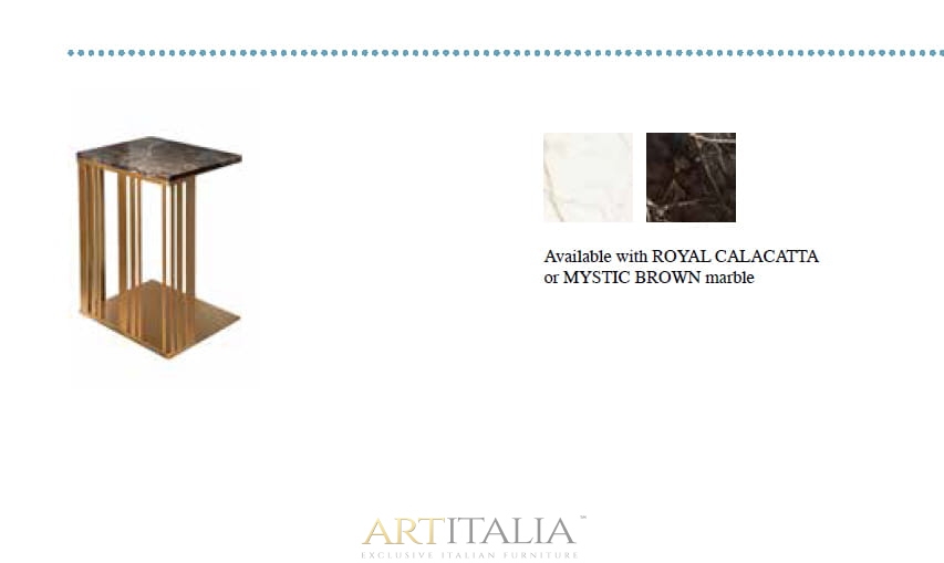 - Blat z marmuru: Centralnym punktem stolika jest prostokątny blat, wykonany z marmuru z subtelnym żyłkowaniem (ROYAL CALACATTA lub MYSTIC BROWN. Kolorystyka blatu stanowi elegancki dopasowanie dla kolorystyki tkanin obiciowych sof Atmosfera.