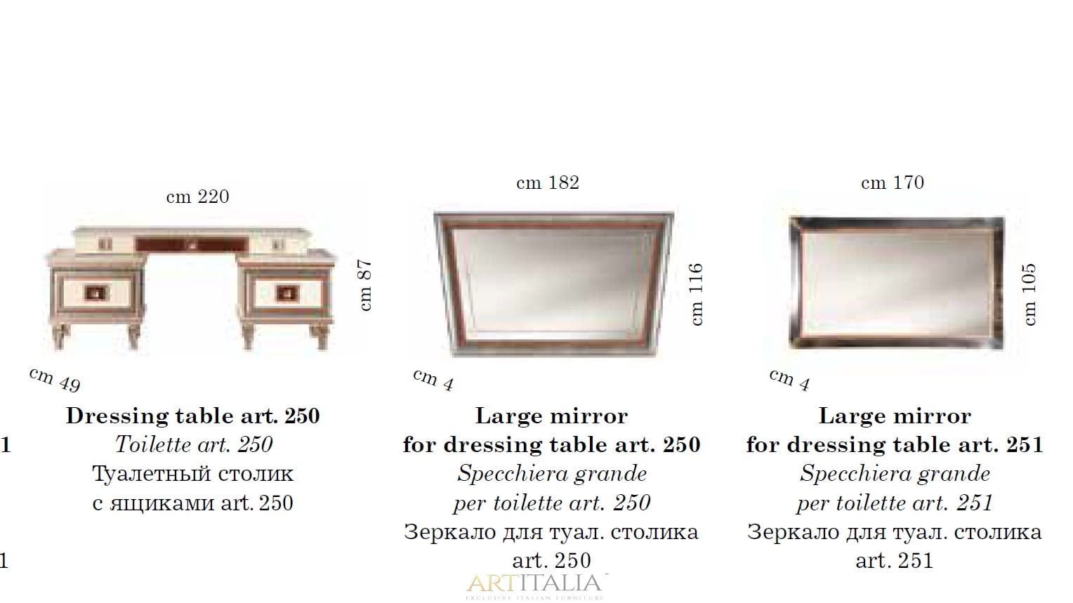 - toaletka z dwoma szafkami bocznymi lub wersja z jedną szafką boczną + lustra (duże oraz małe)